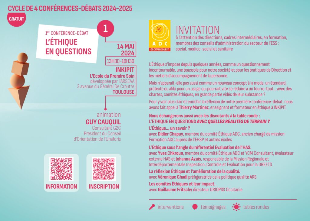 En 2024, l’ADC (Association de Directrices, Directeurs et Cadres de direction du secteur social, médico-social et sanitaire) s’associe à Inkipit pour un cycle de conférences-débats autour de « L’éthique en questions ».